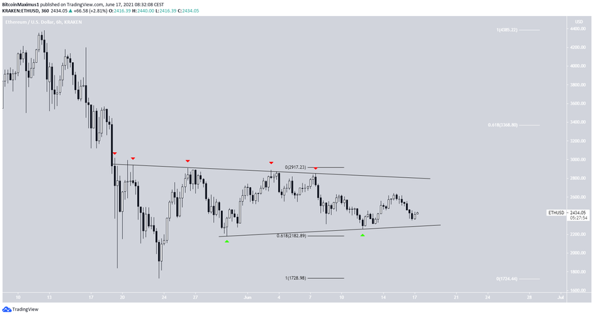 ETH podąża za wznoszącą się linią wsparcia od dnia 30 maja, kiedy to odbił się od poziomu wsparcia przy zniesieniu 0,618 Fib (zielona ikona). Wraz z wcześniej zarysowaną linią oporu, tworzy to formację trójkąta symetrycznego.