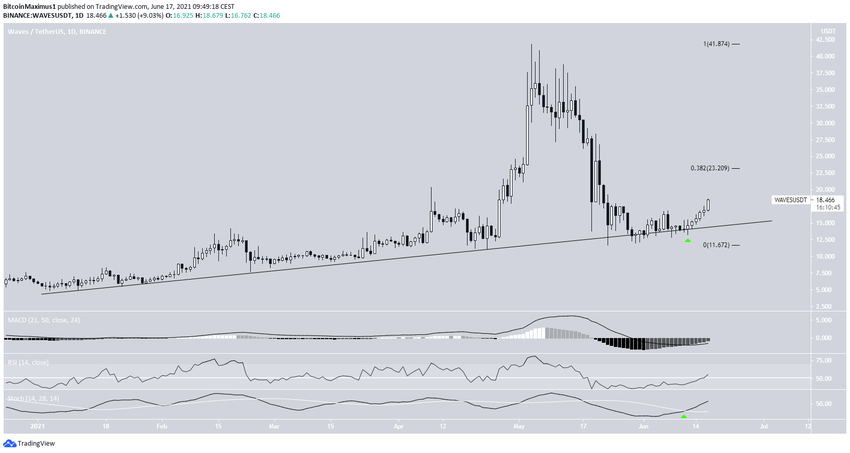 W dniu 23 maja WAVES osiągnął dołek na poziomie 11,68 USD, potwierdzając długoterminową linię wsparcia, która obowiązuje od początku roku.