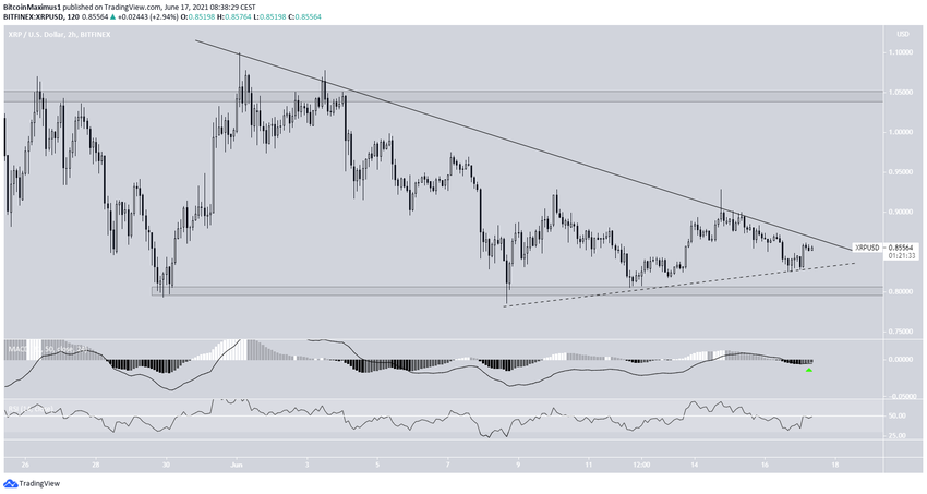 Sponsored SponsoredWsparcie znajduje się na poziomie 0,80 USD, utworzonym przez dołki z 29 maja. XRP początkowo odbił się powyżej tego wsparcia w dniu 8 czerwca. Od tego czasu notuje nieco wyższe szczyty wzdłuż rosnącej linii wsparcia (przerywana). Dodatkowo, dwugodzinny MACD dał byczy sygnał odwrócenia, a RSI jest bliski osiągnięcia tego samego.