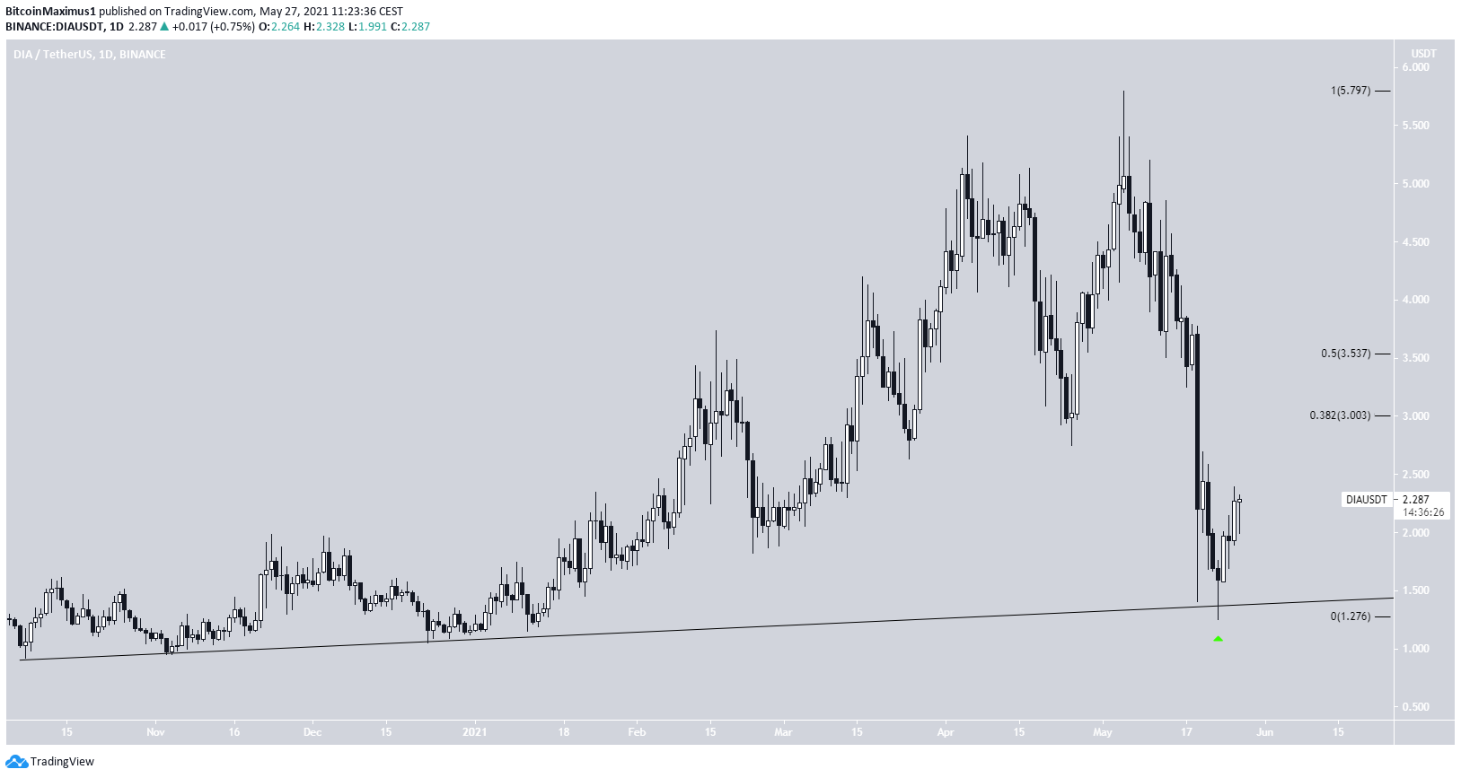 DIA spada od momentu osiągnięcia wartości 5,80 USD w dniu 5 maja. 23 maja altcoin osiągnął lokalny dołek na poziomie 1,25 USD.