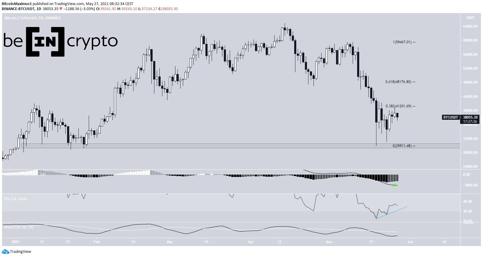 BTC rośnie od dnia 19 maja, kiedy osiągnął dołek na poziomie 30 000 USD. W dniach 23 i 24 maja utworzył wyższy dołek i byczą świecę pochłaniającą.