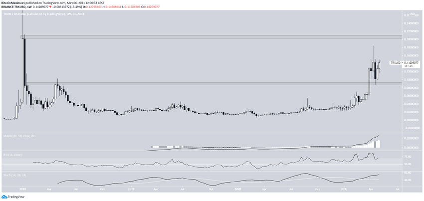 W dniu 23 kwietnia TRX powrócił w celu zweryfikowania długoterminowego obszaru na 0,09 USD jako wsparcia. Od tego czasu przesuwa się w górę.