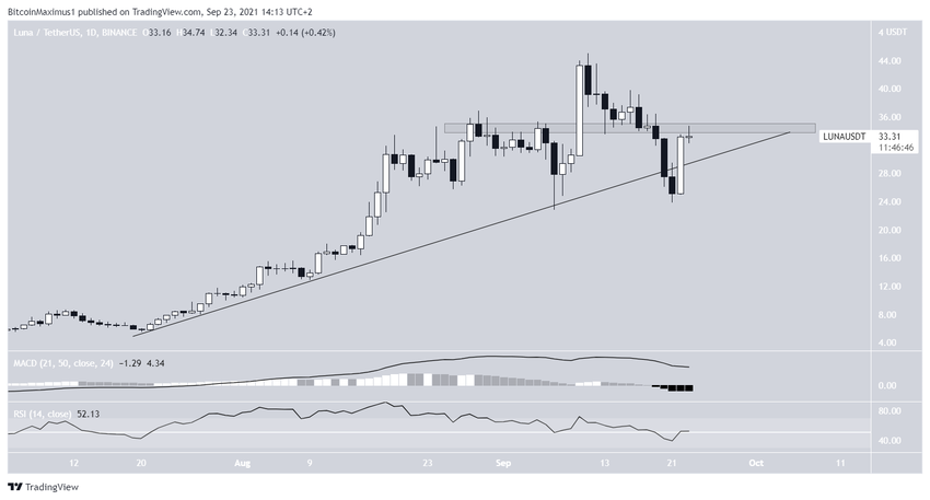 LUNA wzrasta wzdłuż wznoszącej się linii wsparcia od dnia 20 lipca. Doprowadziło to do osiągnięcia nowego rekordu wszech czasów na poziomie 45 USD w dniu 11 września.