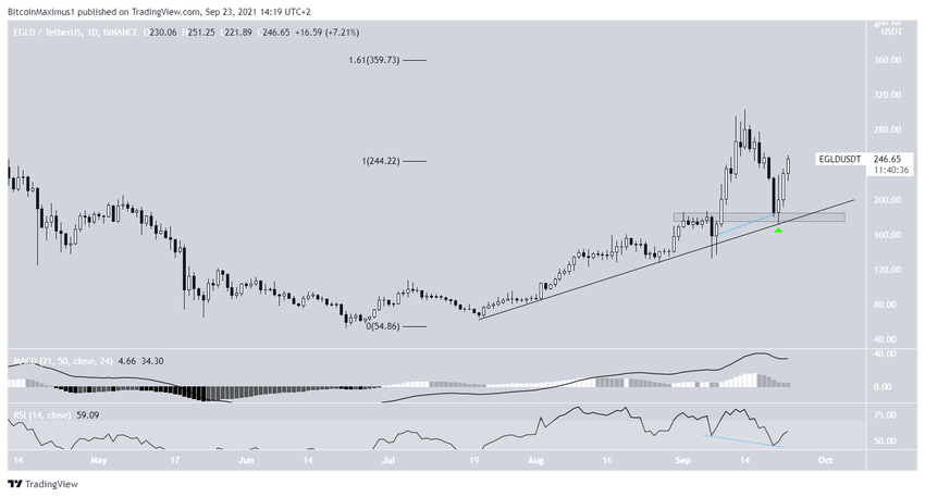 EGLD podąża za roznącą linią wsparcia od dnia 20 lipca. Po odbiciu w dniu 8 września, tempo wzrostu przyspieszyło i 14 września altcoin osiągnął nowy rekord wszech czasów na poziomie 303 USD.