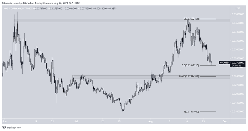 XVG spada od dnia 16 sierpnia, kiedy to został odrzucony przez obszar oporu na 0,0365 USD.