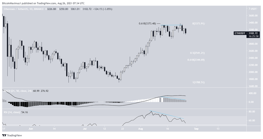 ETH został jednak odrzucony przez poziom oporu zniesienia 0,618 Fib i utworzył formację podwójnego szczytu. Co więcej, formacja ta była połączona z niedźwiedzimi dywergencjami na RSI i MACD.