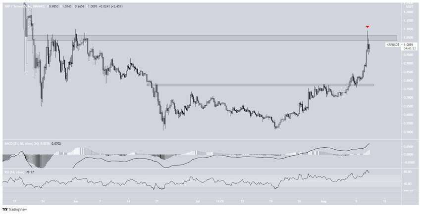 W dniu 7 sierpnia XRP przełamał horyzontalny obszar oporu przy 0,77 USD i zatwierdził go jako wsparcie.