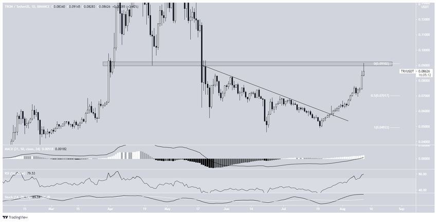 TRX nie zdołał jednak wyjść ponad kluczowy obszar oporu 0,91 USD i zamiast tego został odrzucony. Ponadto, rajd stał się paraboliczny.