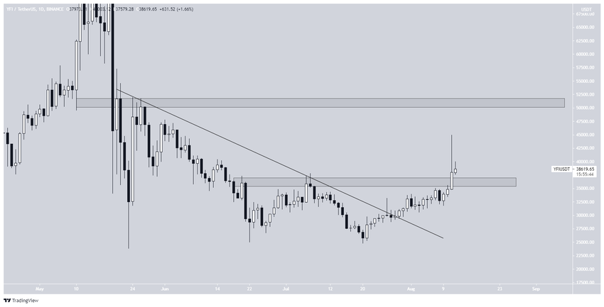 YFI porusza się w górę od 20 lipca. W dniu 28 lipca udało mu się wybić ponad opadającą linię oporu.