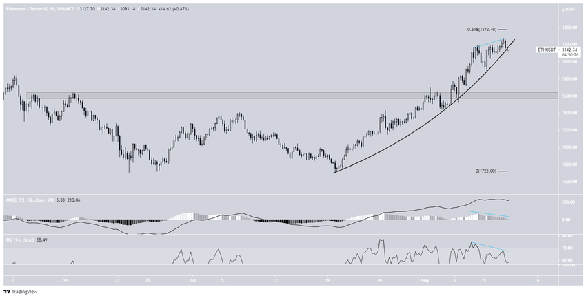 Jednakże, ten szczyt był połączony z niedźwiedzimi dywergencjami na RSI i MACD. Od tego czasu ETH spada i jest w trakcie przełamywania parabolicznej, wznoszącej się linii wsparcia.