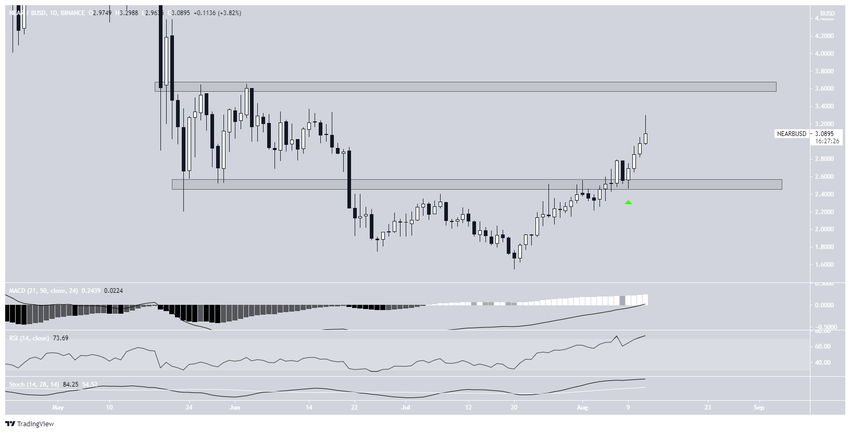 NEAR porusza się w górę od 20 lipca. W dniu 5 sierpnia kurs odzyskał poziomy obszar oporu przy 2,50 USD i potwierdził go jako wsparcie (zielona ikona). Główny opór znajduje się na poziomie 3,65 USD.