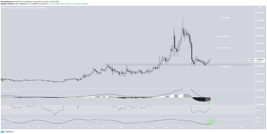 XEM odbił się niemal natychmiast po tym, tworząc wzór podwójnego dna. Poza tym, że jest to byczym wzorem odwrócenia, zbiegło się również z byczą dywergencją na RSI. MACD również stał się byczy, a oscylator stochastyczny jest blisko takich odczytów.