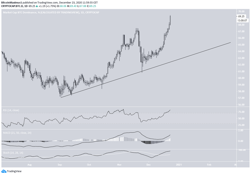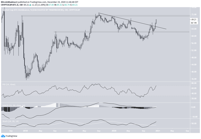 Wskaźnik dominacji Bitcoina (BTCD) wybił się z długoterminowej linii oporu i ma na celu osiągnięcie długoterminowego obszaru oporu w pobliżu 71%.
