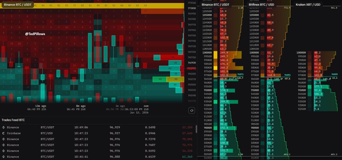 Dodatkowo, trader analizujący dane z giełd Ted Pillows, wskazuje na silną strefę podaży. Między 97 000 a 100 000 USD ustawiono zlecenia sprzedaży o wartości ponad 232 mln USD. To pokazuje, że niedźwiedzie aktywnie bronią tego zakresu. Jednocześnie jego przełamanie mogłoby wywołać dynamiczny ruch w górę. Pillows podzielił się: