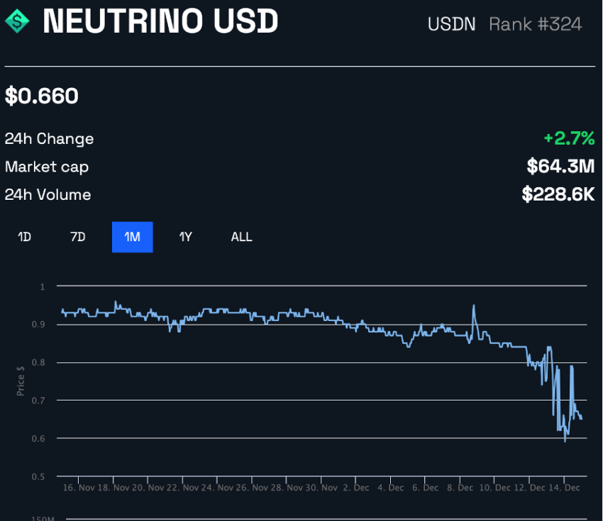 Na przykład, Neutrino USD (USDN) spadł poza punkt cenowy 0,95 USD w tym samym okresie. W momencie pisania artykułu, walczy on obecnie w okolicach 0,66 USD. USDN spadł gwałtownie w ciągu ostatnich 12 godzin.