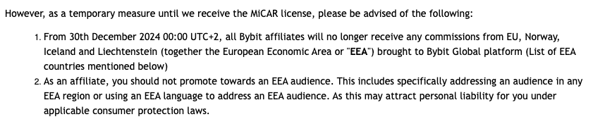 Zgodnie z oficjalnym e-mailem wysłanym do współpracujących z giełdą influencerów i afiliantów, zmiany wejdą w życie od 30 grudnia 2024 roku o godzinie 00:00 UTC+2. Wówczas wszyscy afilianci ByBit z krajów Europejskiego Obszaru Gospodarczego (EEA), w tym z Polski, Norwegii, Islandii i Liechtensteinu, nie będą już otrzymywać prowizji za użytkowników poleconych do globalnej platformy ByBit. Ponadto, obowiązywać będzie zakaz aktywnej promocji wśród tych użytkowników.
