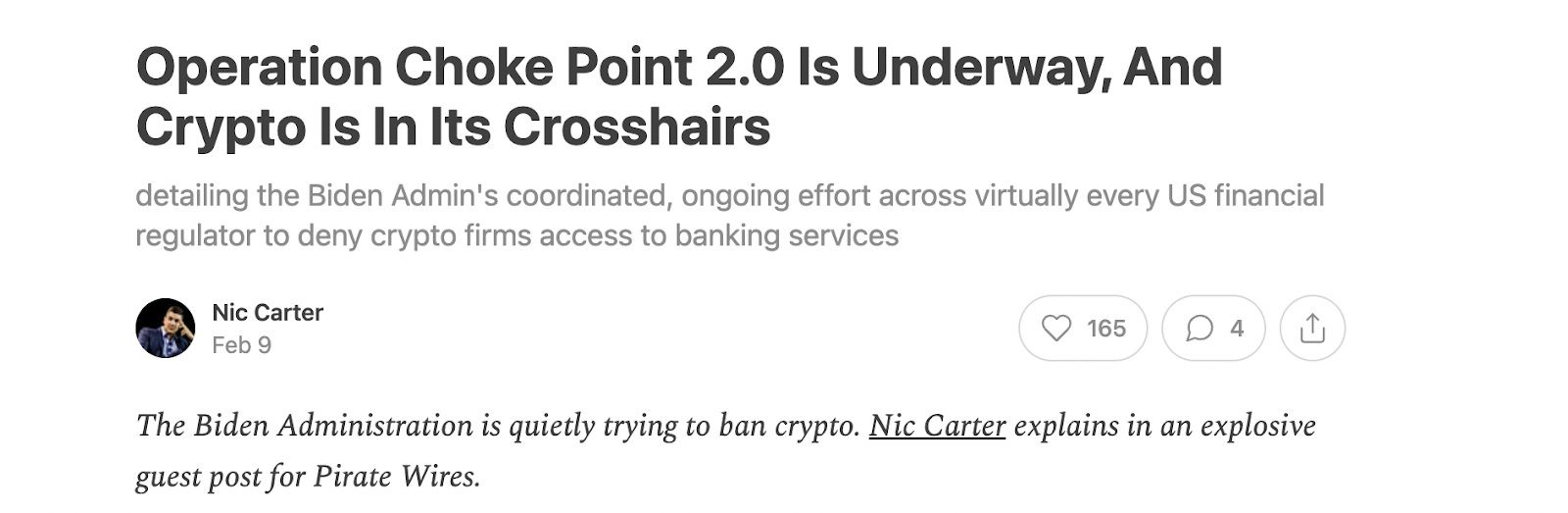 Operacja Choke Point była rozprawą amerykańskich organów regulacyjnych z firmami określonymi jako “wysoce ryzykowne” w 2013 r. Była to operacja, która odcięła dostęp do banków firmom związanym z bronią palną, narkotykami, pożyczkami itp. Inwestor Nic Carter uważa, że rząd rozpoczął podobną rozprawę z firmami w branży cyfrowych aktywów od dnia 3 stycznia tego roku.