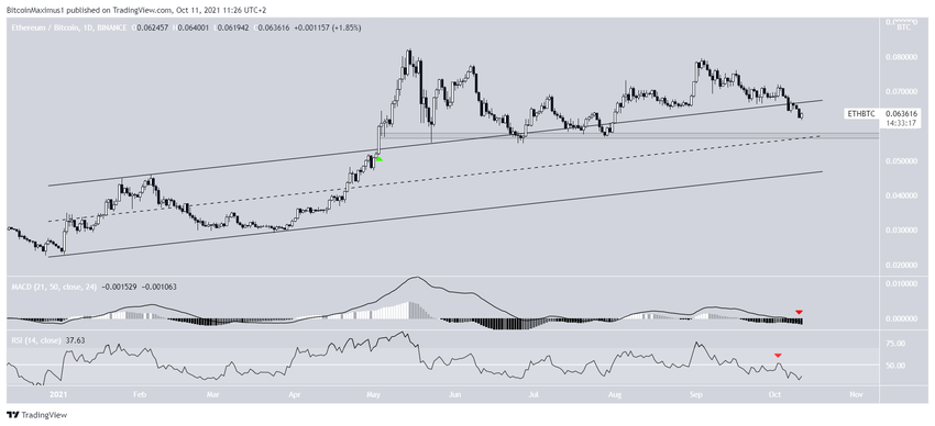 Para ETH/BTC zapewnia niedźwiedzie perspektywy. Pierwszym powodem tego jest fakt, że Ethereum powróciło do wnętrza wznoszącego się kanału równoległego, który utrzymywał się od stycznia do kwietnia.