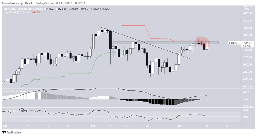 Wykres dzienny pokazuje, że Ethereum jest obecnie w trakcie ruchu powyżej 3600 USD. Jest to ostatni poziom oporu przed wrześniowym szczytem na 4027 USD. Obszar 3600 USD jest zarówno poziomym poziomem oporu, jak i zbiega się z linią oporu supertrendu (czerwone kółko).