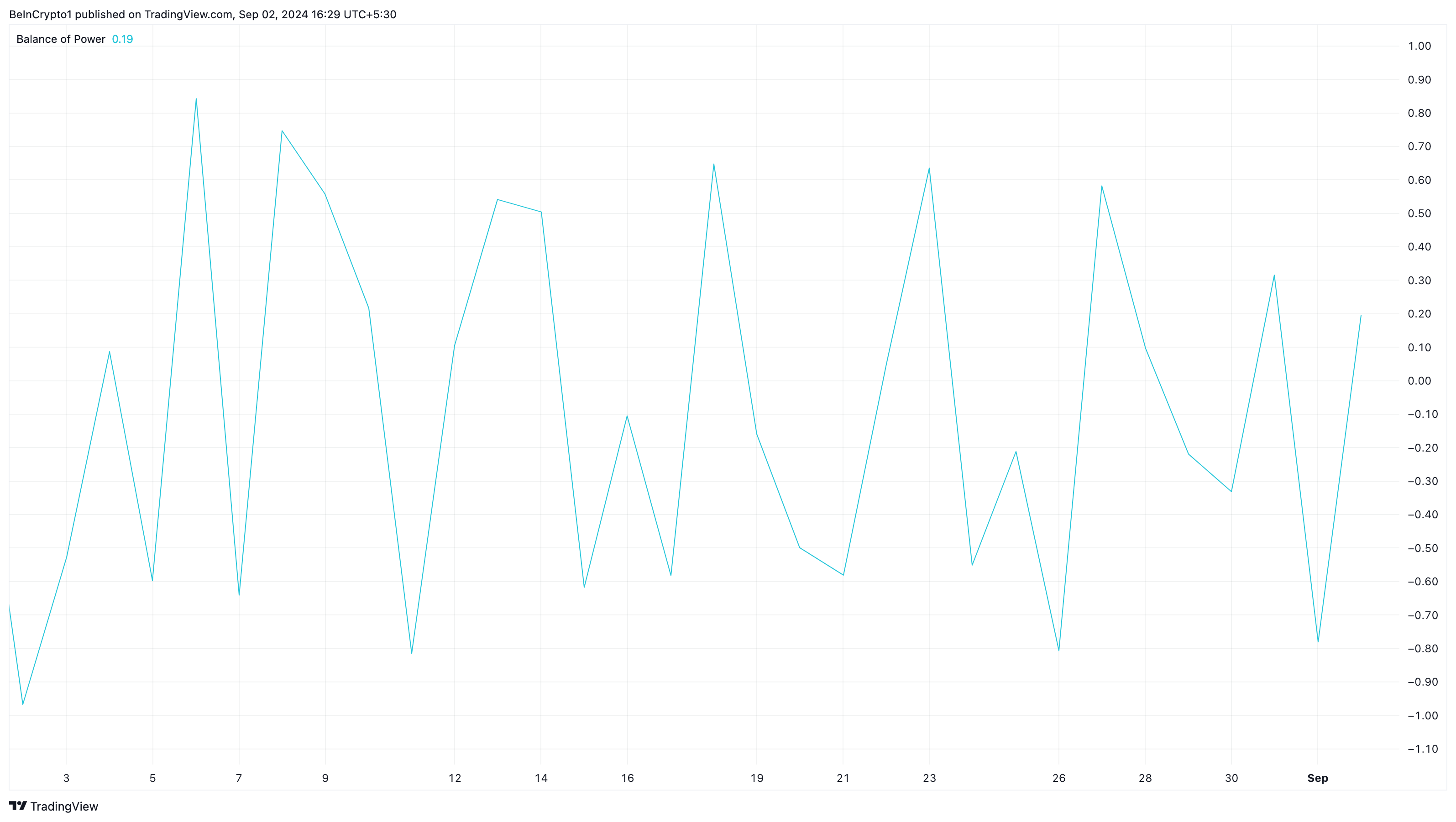 Dzienny wykres wskazuje, że Balance of Power (bop), narzędzie techniczne mierzące siłę rynkową kupujących wobec sprzedających, wspiera potencjalne odbicie ceny Toncoin.