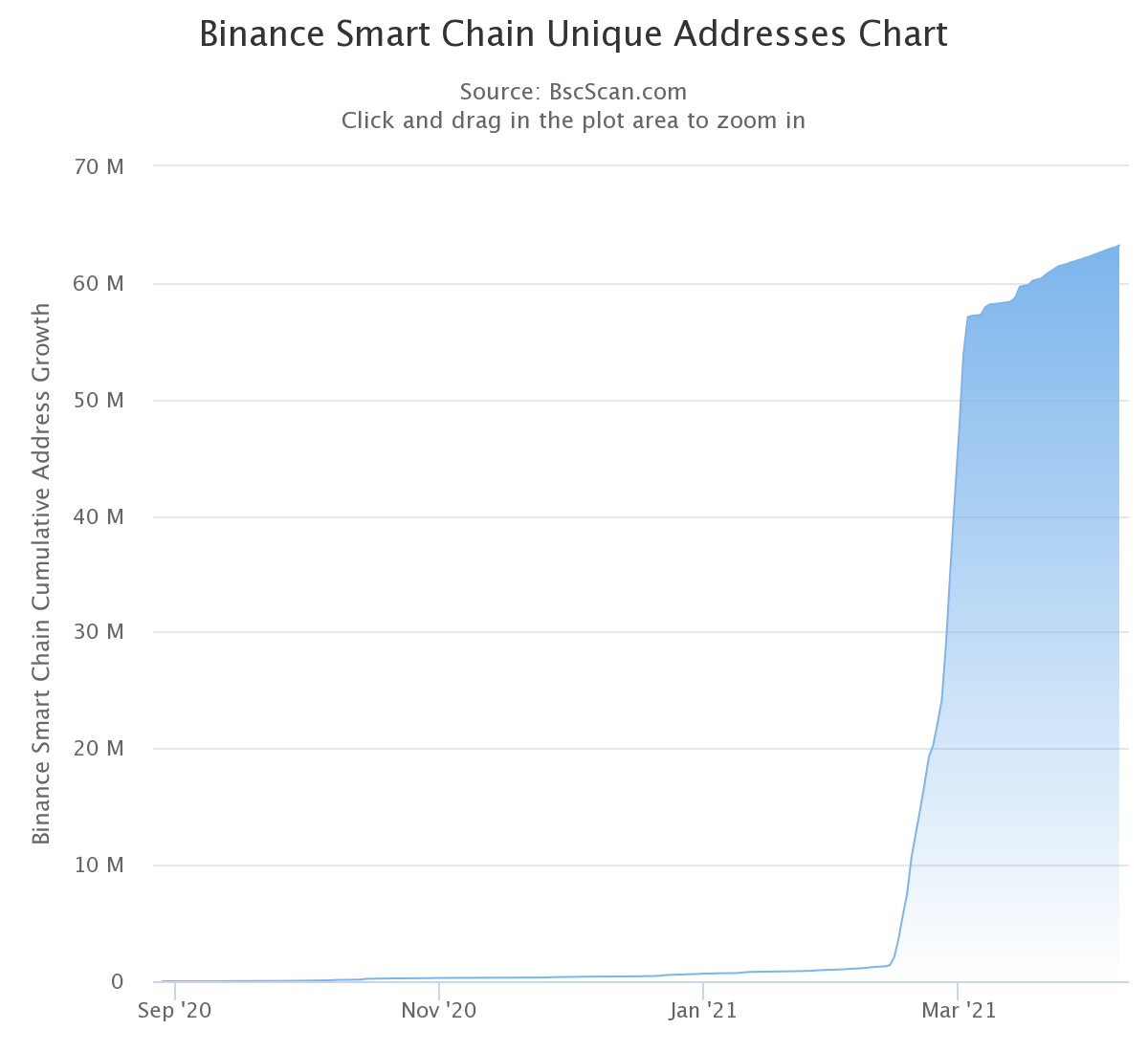 Jeśli dodać do tego kompatybilność z siecią Ethereum, to istnieją przekonujące powody dla użytkowników i deweloperów, aby przejść na BSC. Obecnie z sieci korzysta już ponad 63 mln unikalnych adresów. W połowie lutego zaobserwowano wertykalny wzrost liczby użytkowników przechodzących na BSC.