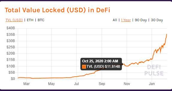 Równolegle z cenami tokenów DeFi, do nowego rekordu wzrosła też całkowita wartość zablokowana (TVL) w protokołach. Wartość ta wzrosła ponad dwukrotnie od początku 2020 roku, kiedy to wynosiła niewiele ponad 15 miliardów dolarów. TVL jest dobrym przykładem obrazującym wzrost sektora DeFi w ostatnim roku.
