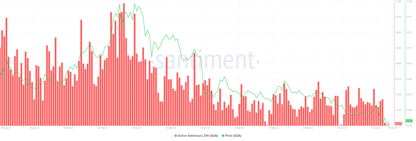 Brak potencjału do tego impulsu wynika prawdopodobnie z tego, że posiadacze ADA w minimalnym stopniu uczestniczą w sieci. Spadek zaangażowania to reakcja inwestorów, którzy starają się unikać strat, nie dokonując transakcji.