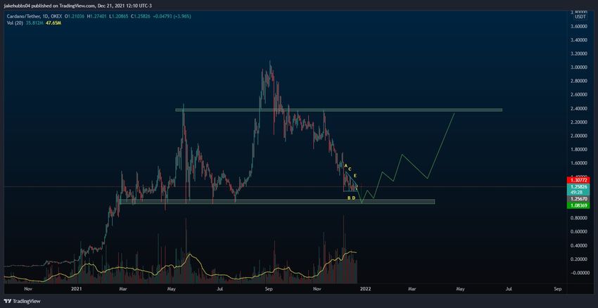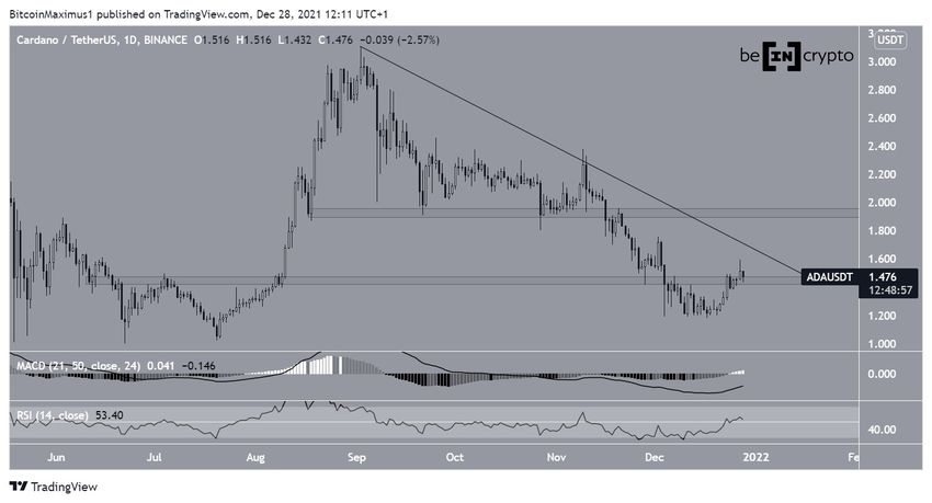 Cardano spada wzdłuż opadającej linii oporu od czasu osiągnięcia rekordu wszech czasów (ATH) na poziomie 3,1 USD w dniu 2 września. Ruch spadkowy trwał do 4 grudnia, kiedy to ADA osiągnęła dołek na poziomie 1,18 USD.