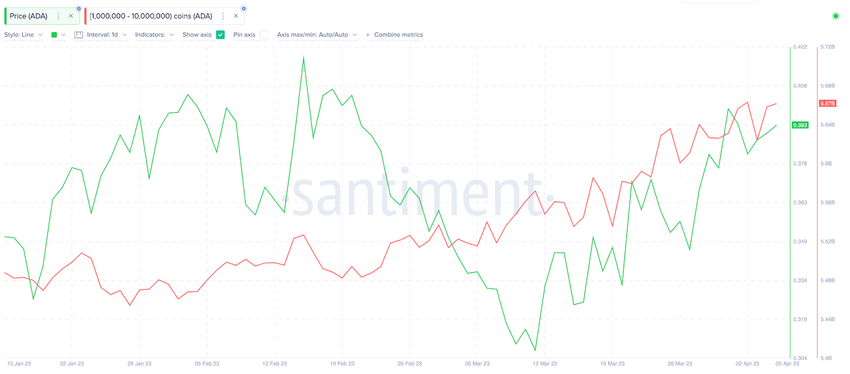 Według Santiment, krypto wieloryby posiadające od 1 miliona do 10 milionów ADA są obecnie w trybie akumulacji. Czerwona linia na poniższym wykresie pokazuje, jak dodali oni 150 milionów monet do swoich sald.