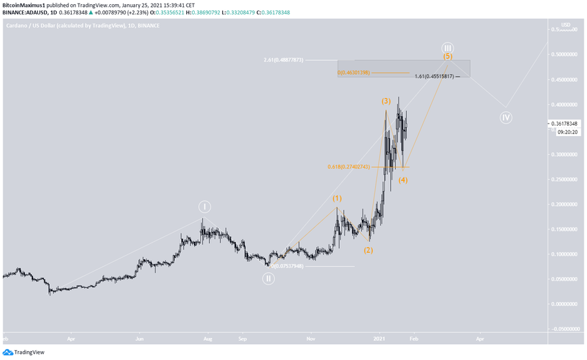 Liczba fal sugeruje, że Cardano znajduje się w długoterminowej fali 3 (białej) byczego impulsu, który rozpoczął się od marcowych minimów. Jeśli taka liczba fal jest poprawna, to ADA znajduje się obecnie w podfali 5 (pomarańczowej) owej długotrwałej fali 3.