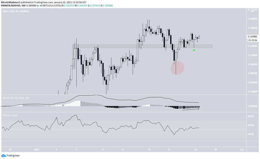 Niemniej jednak krótkoterminowy wykres sześciogodzinny jest nieco bardziej byczy. Wygląda na to, że ADA odzyskało obszar 0,34 USD po początkowym spadku znacznie poniżej niego (pokazanym czerwonym kółkiem).