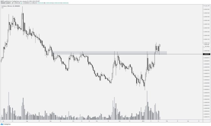 Poprzedni obszar oporu to 960 satoshi, a wcześniej Cardano znajdowało się poniżej tego obszaru od września 2020 r. W dniu 21 stycznia potwierdziło go jako wsparcie i od tego czasu rośnie.