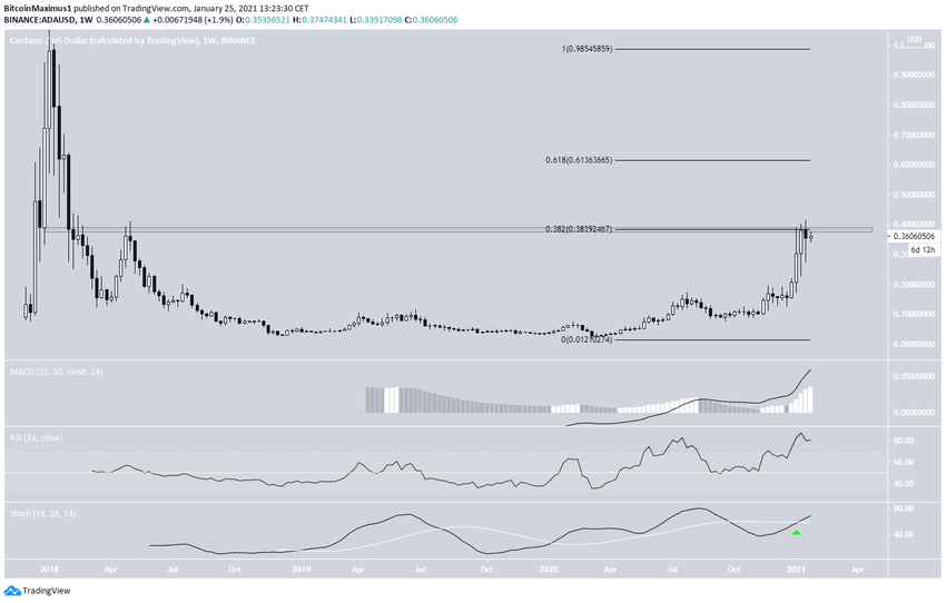 Wykres tygodniowy pokazuje, że ADA jest notowana na długoterminowym obszarze oporu przy 0,38 USD, który jest poziomem zniesienia 0,382 Fib, mierzonym od rekordowej ceny z grudnia 2017 r.