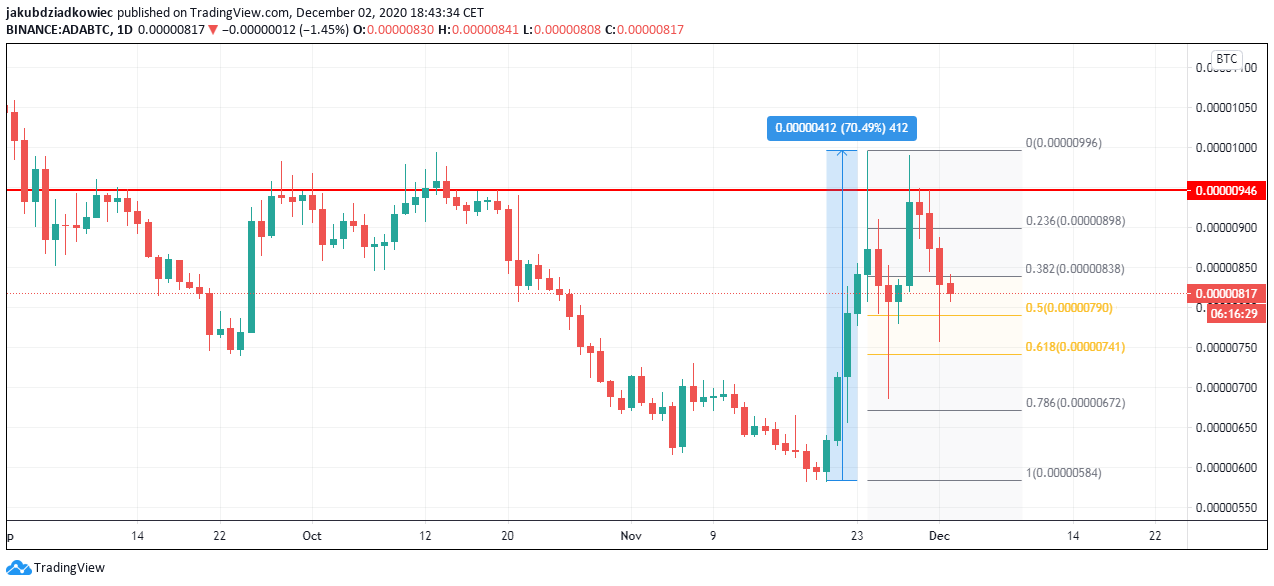 Dzienny wykres dla pary ADA/BTC również pokazuje impulsywny wzrost w okresie ostatnich dwóch tygodni. Od dnia 20 listopada Cardano zyskało względem Bitcoina 70% wartości i z wyceny na 580 satoshi błyskawicznie powróciło w obszar oporu na 950 satoshi, który historycznie często służył za wsparcie i opór.
