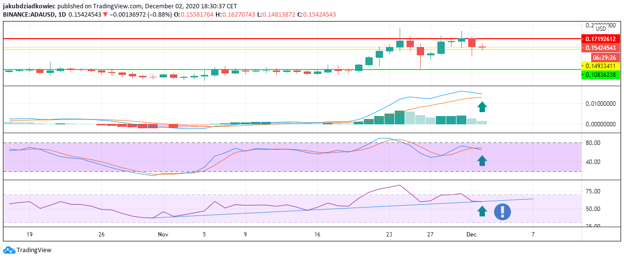 Bardzo istotna jest dynamika RSI, który spadł z wykupionego obszaru i aktualnie testuje ważną linię trendu wzrostowego, która obowiązuje od końca października. Spadek poniżej tej linii, byłby bardzo negatywnym sygnałem i zapewne doprowadziłby do utraty przez ADA wsparcia na 0,15 USD. Z drugiej strony utrzymanie linii trendu i odbicie może zaprowadzić cenę do ponownej, mocniejszej próby przebicia długoterminowego oporu na 0,17 USD.