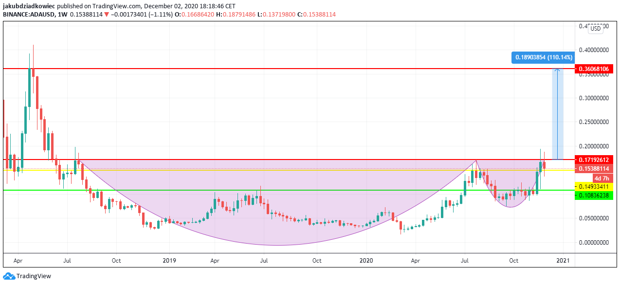 Na tygodniowym wykresie ADA dostrzegamy tworzący się coraz wyraźniej wzorzec filiżanki z uchwytem (cup and handle). Jego oporem jest wspomniany wyżej poziom 0,17 USD, którego przebicie może ponownie doprowadzić do ekspotencjalnego wzrostu Cardano.