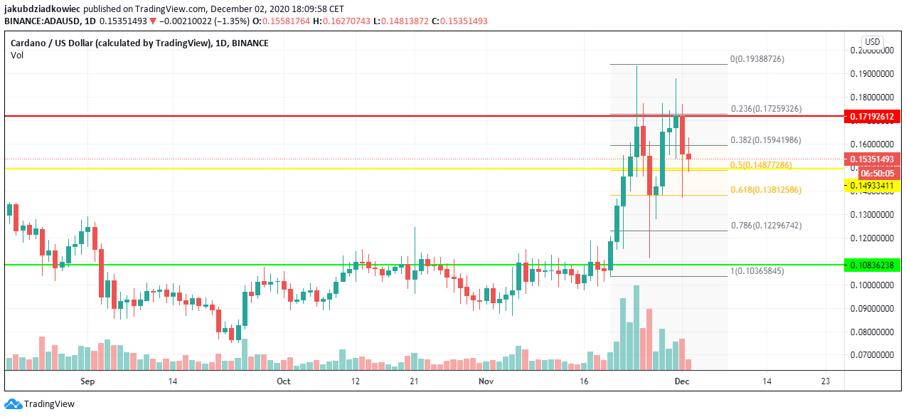 Aktualnie ADA notowana jest w zakresie pomiędzy 0,15 a 0,17 USD, które odpowiadają poziomom 0,5 i 0,236 Fib całego ruchu wzrostowego. Obszary te są szczególnie ważne dla ADA i stanowią długoterminowy opór. Szczególnie poziom 0,17 USD był wielokrotne wsparciem i oporem w 2018 roku oraz ostatnio został dotknięty w lipcu 2020.