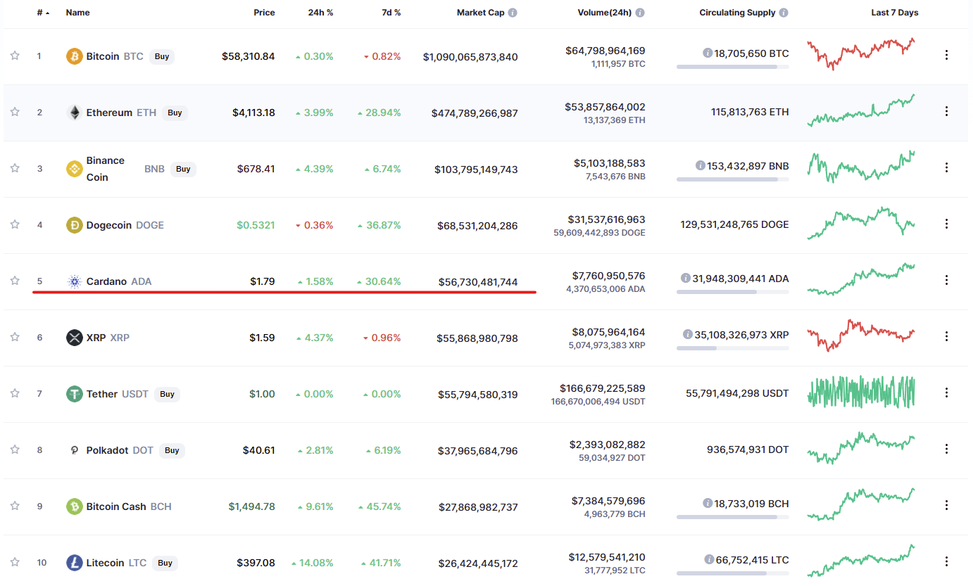 Wzrost ceny oznacza teraz, że ADA przekroczyła kapitalizację rynkową USDT i XRP, zajmując piąte miejsce w rankingu kryptowalut. Jej całkowita kapitalizacja rynkowa wynosi aktualnie 56,7 mld USD.
