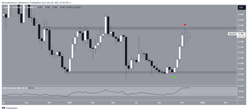 Wzrost cen ADA osiągnął szczyt na poziomie 0,41 USD dwa tygodnie temu. Jednak nie wybił się z długoterminowego przedziału, który utrzymuje się od ponad roku. Zamiast tego utworzył długi górny knot (czerwona ikona) i lekko opadł.