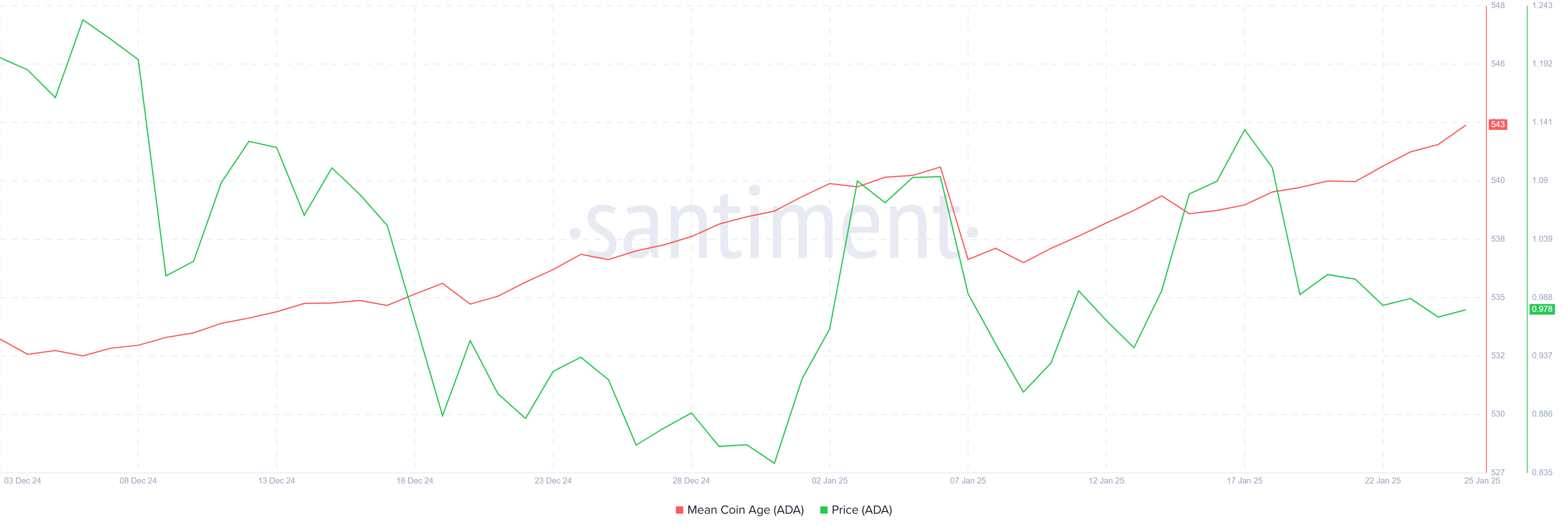 Wskaźnik średniego wieku monet dla Cardano rośnie, sygnalizując pozytywne nastroje na rynku. Ten wskaźnik pokazuje, że długoterminowi posiadacze (LTH) wolą zatrzymać swoje ADA niż sprzedawać. To zachowanie stabilizuje cenę Cardano, zapobiegając gwałtownemu spadkowi pomimo braku znaczącego byczego impetu w ostatnich tygodniach.