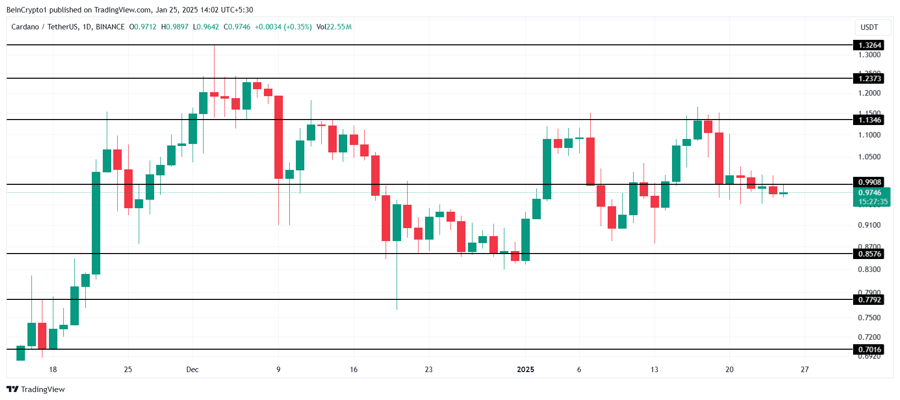 Cardano obecnie handluje na poziomie 0,97 USD, tuż poniżej poziomu wsparcia 0,99 USD, po nieudanej próbie przebicia bariery 1,13 USD. Ta niezdolność do utrzymania kluczowych poziomów podkreśla wyzwania, przed którymi stoi altcoin w budowaniu wzrostowego impetu.