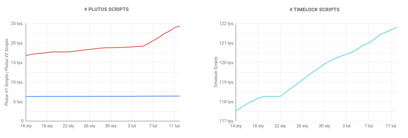 Pod koniec 2023 roku, liczba obsługiwanych inteligentnych kontraktów przekroczyła 14 000. Obecnie, zaledwie w ciągu 11 dni lutego, do systemu dodano ponad 5 000 nowych. Skrypty Plutus V2 odnotowały szczególny wzrost, osiągając 23 896, co znacznie przewyższa wynik skryptów V1, które wzrosły do 6 400. To dynamiczne tempo rozwoju potwierdza, że Cardano stoi na czele ewolucji w świecie kryptowalut, integrując coraz więcej funkcji smart kontraktów.
