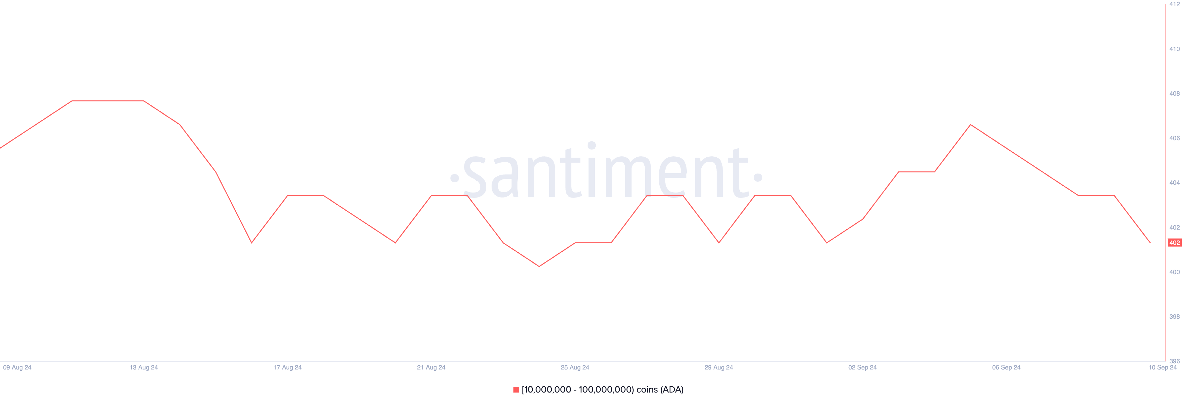 Spadająca aktywność wielorybów Cardano dodatkowo wzmacnia tę perspektywę. Dane o dystrybucji podaży pokazują, że duzi inwestorzy posiadający od 10 mln do 100 mln ADA stopniowo zmniejszali swoje udziały od 5 września.