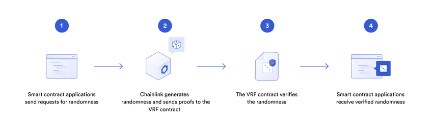Chainlink VRF działa poprzez połączenie danych blokowych, które pozostają nieznane, gdy żądanie jest wykonywane. Posiadają one wstępnie zadeklarowany klucz prywatny węzła wyroczni w celu wygenerowania zarówno liczby losowej, jak i dowodu kryptograficznego.