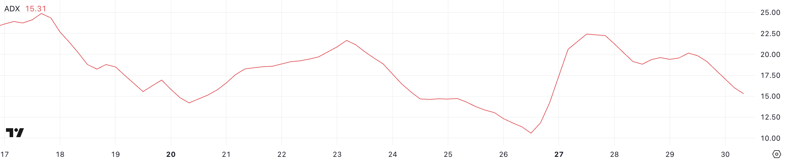 ADX dla Cardano wynosi obecnie 15,3, spadając z 22,2 trzy dni temu po ogłoszeniu mapy drogowej nadchodzących zmian. Wskaźnik ADX (średni wskaźnik kierunkowy) mierzy dynamikę trendu. Wartości poniżej 20 sygnalizują słabe lub nieistniejące trendy, podczas gdy odczyty powyżej 25 wskazują na rozwijający się trend.