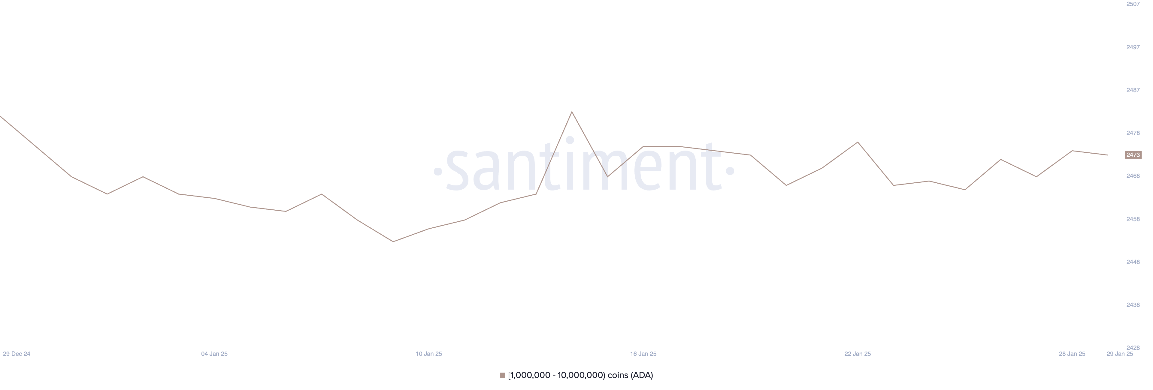 Liczba adresów wielorybów – portfeli posiadających od 1 mln do 10 mln ADA – wynosi obecnie 2473, pozostając w wąskim zakresie od 2465 do 2476 w ciągu ostatnich 15 dni.