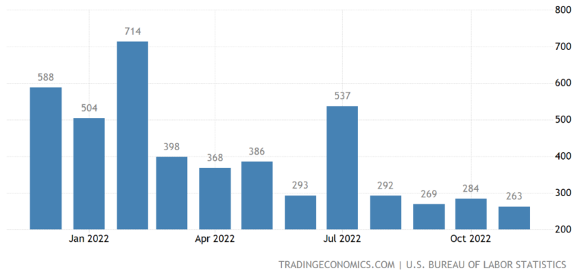 Wyższa niż oczekiwana ilość nowych miejsc pracy w listopadzie 2022 r. jest najniższym przyrostem miejsc pracy od kwietnia 2021 r. Dane to pojawiają się po zrewidowanym wzroście o 284 000 nowych miejsc pracy w październiku 2022 r.