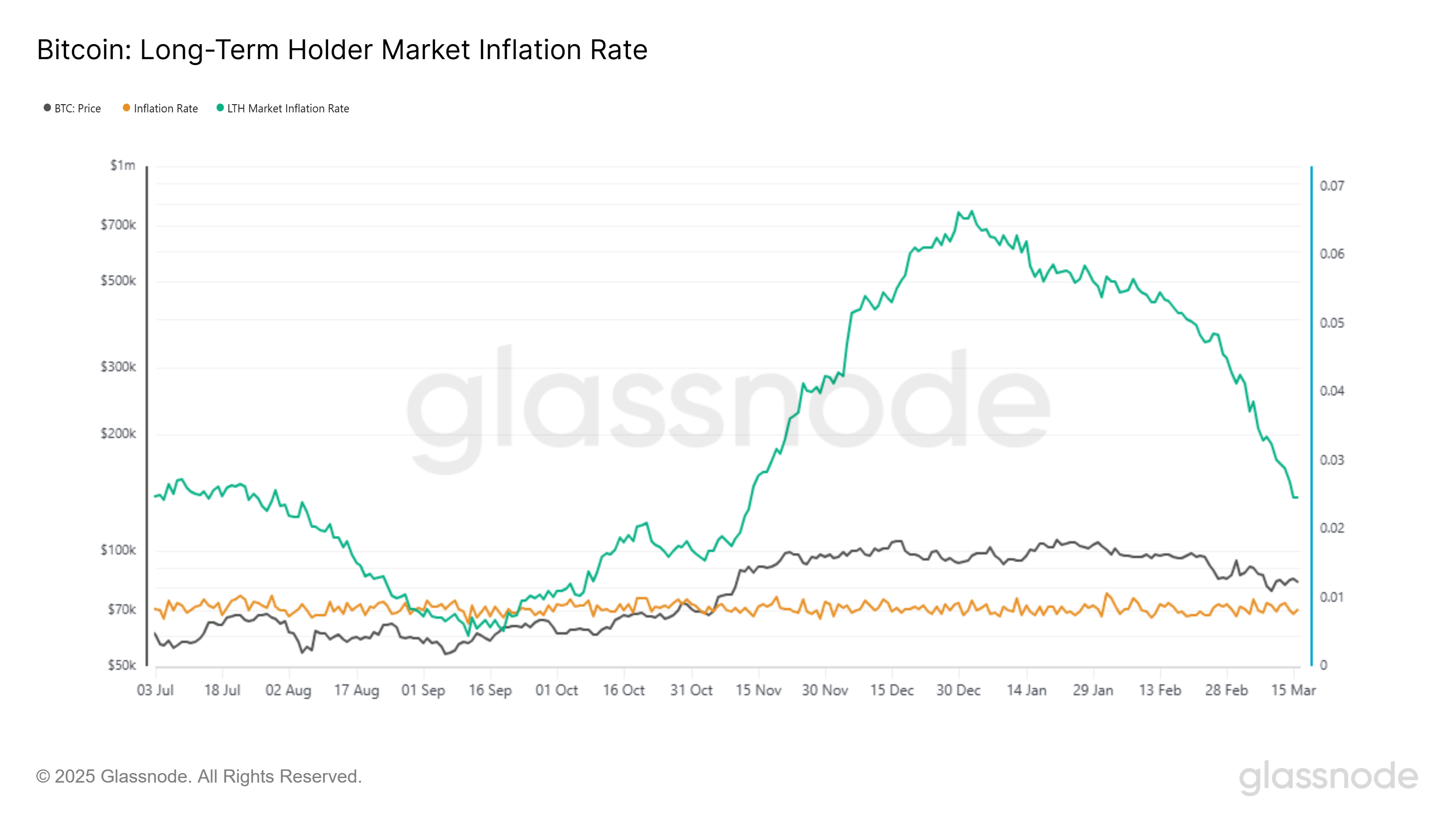 Wskaźnik inflacji rynku długoterminowych posiadaczy mierzy roczną stopę netto akumulacji lub dystrybucji przez LTH w stosunku do emisji przez górników. Obecnie wartości 0,025 sugerują, że LTH nadal zwiększają presję sprzedażową. Chociaż ten wskaźnik odnotowuje spadek, nadal wpływa na ruch ceny Bitcoina.