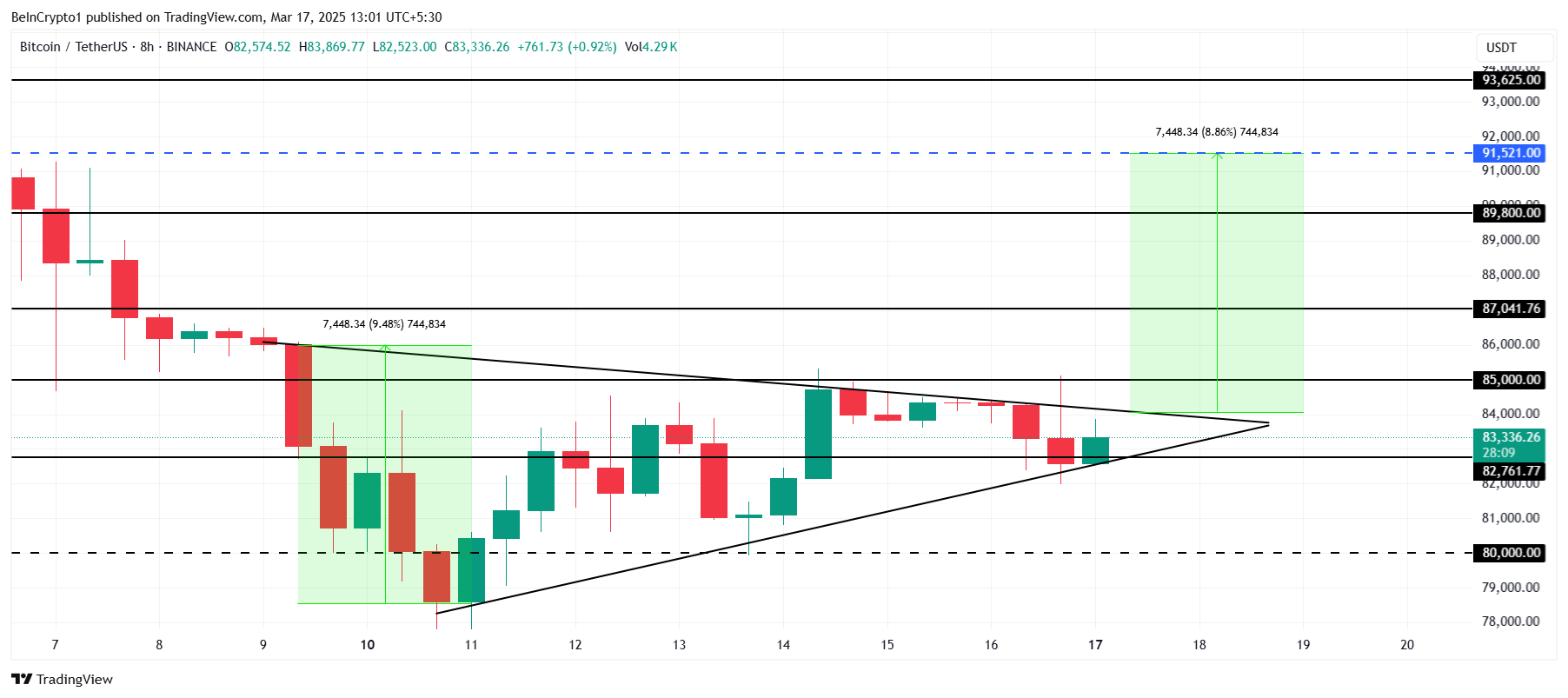 Cena Bitcoina przygotowuje się do potencjalnego wybicia, które może doprowadzić powyżej 91 000 USD. Największa kryptowaluta obecnie handluje w ramach formacji symetrycznego trójkąta, co sygnalizuje możliwy ruch wzrostowy.
