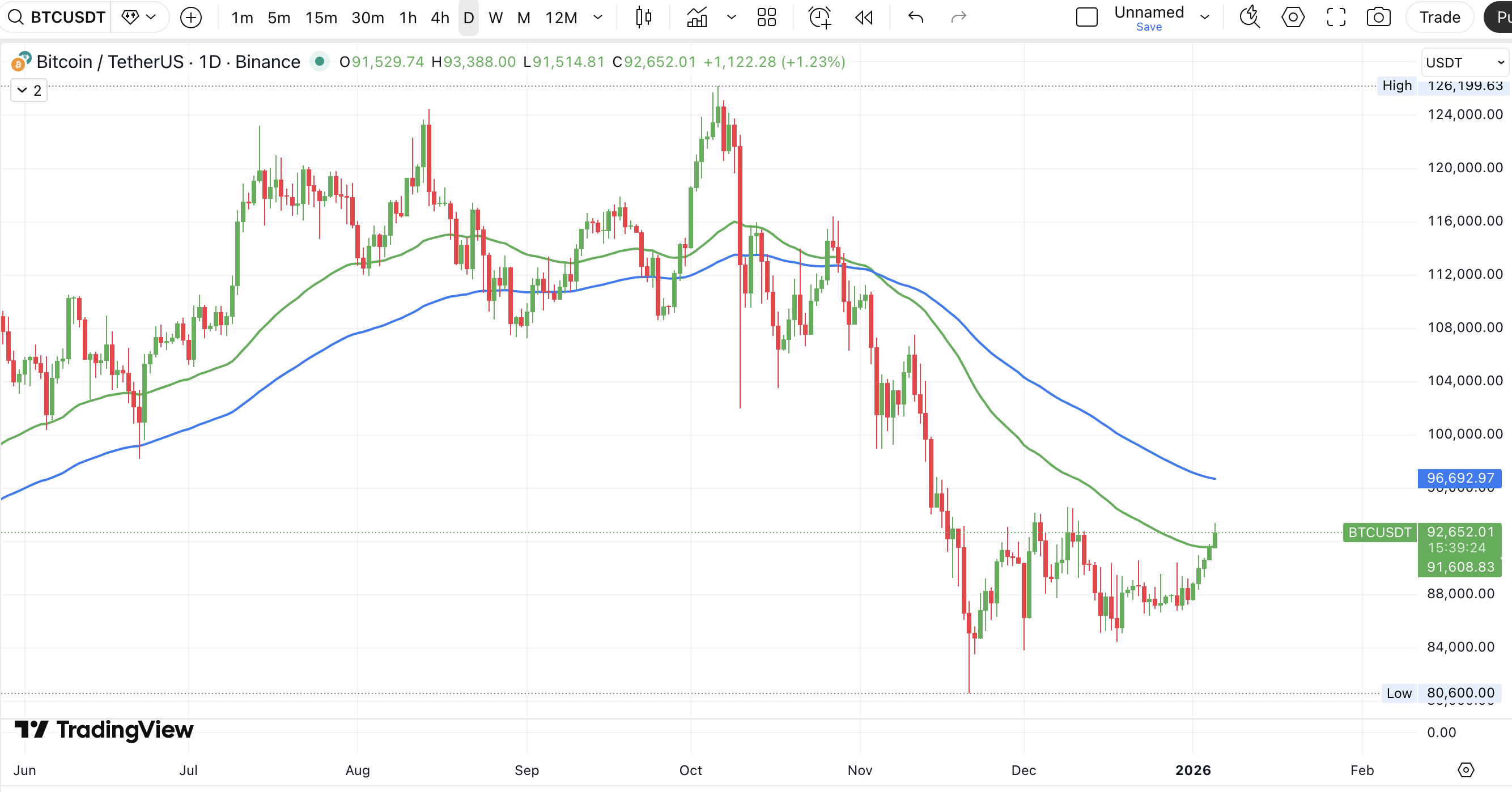 Wieloryby często stabilizują płynność podczas zmiennych okresów. Ich powrót do zakupów sugeruje oczekiwania dalszych wzrostów. Jeśli agresywniejsza akumulacja się utrzyma, może wzmocnić ważne poziomy wsparcia i ustabilizować wzrost ceny Bitcoina na początku 2026 roku.